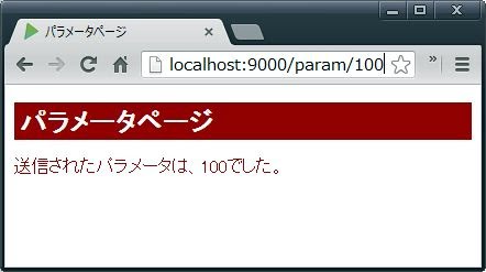 }これがparamアクションのメソッドです。見ればわかるように、paramの後に(id:Long)という引数の指定が追加されています。これに、アクセス時のパラメータが渡されることになります。GET /param/:id controllers.Application.param(id:Long)これでOKです。ここでは、「/param/:id 」という形でアドレスが指定されています。「:id」というのは、ここにidという値が書かれる、ということを示します。その後のメソッド呼び出しを見ると、param(id:Long)というように、idの値が引数に指定されて呼び出されていることがわかるでしょう。