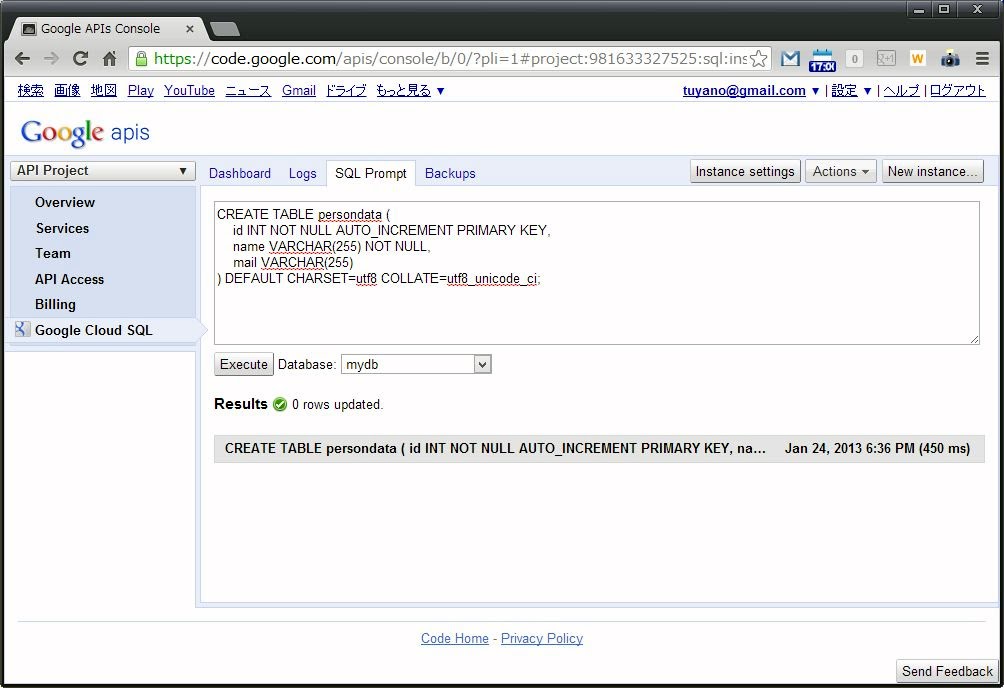 CREATE TABLE persondata (ここでは「persondata」というテーブルを1つ作っておきました。これはid、name、mailといった項目からなるシンプルなテーブルです。idはプライマリキーとなっており、オートインクリメントで値が自動的に割り当てられるようにしておきました。