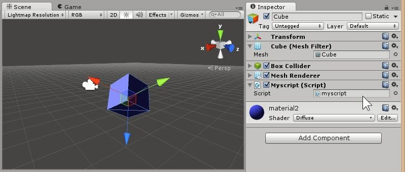 これを選ぶと、選択されたゲームオブジェクトにスクリプトが組み込まれます。インスペクターをチェックすると、「Myscript (Script)」というコンポーネントが追加されているのに気がつくでしょう。