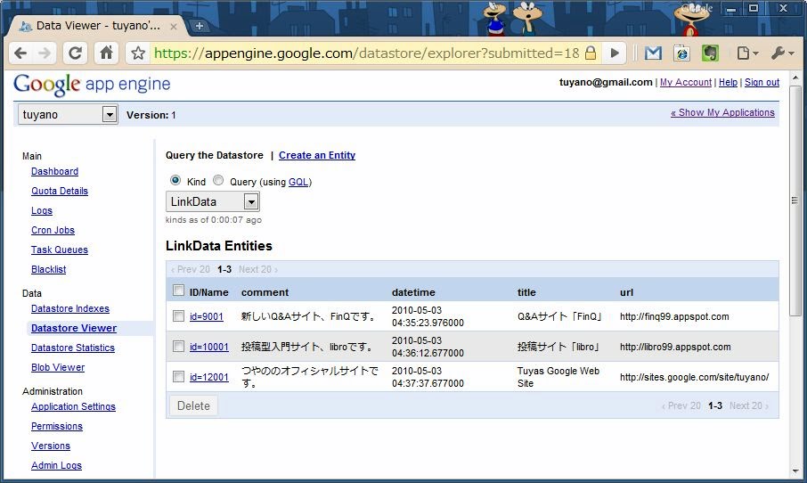 ところで、「まだ何もデータが保管されてないぞ?」と思った人。実は、GoogleのGAEのサイトで、データストアのデータは管理出来るんです。以下のアドレスにアクセスしてください。