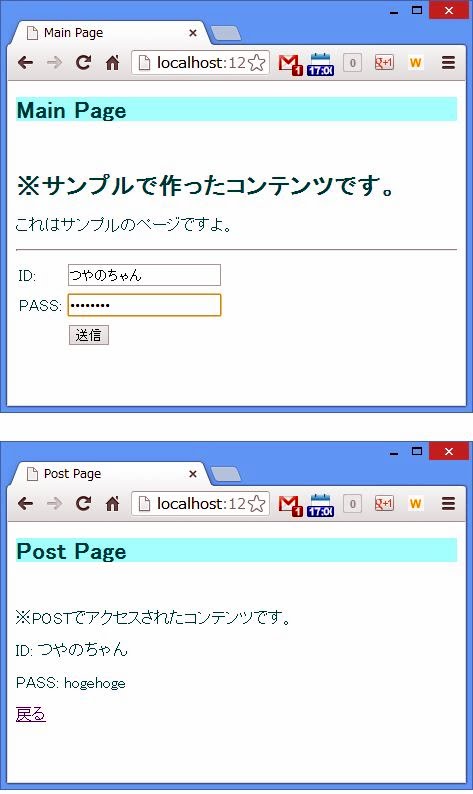 { a: "abc", x:"xyz" }この際、URLエンコードされた値なども自動的に元の文字列に復号されます。こうして得られた変数postから、必要に応じて値を取り出せばいいわけです。今回はcontent3をレンダリングするとき以下のようにしていますね。content: ejs.render(送信された値は、post.idname、post.passで取り出せます。後は、それらをまとめてレンダリングするだけです。