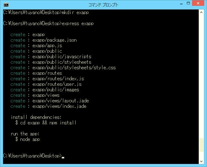express -e フォルダ名」というように実行します。ここでの例なら、「