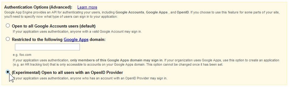 Open IDを使ったログインも利用可能になっています。ただし、これはAPIとして用意されているわけではなく、GAEのアプリケーション作成時に設定する必要があります。