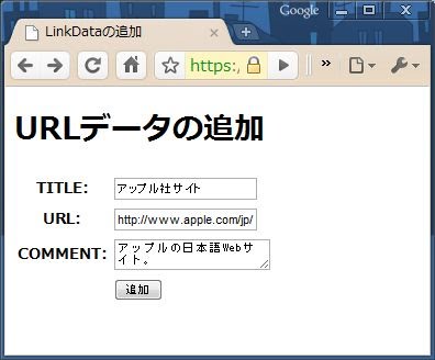 ※add.html <!DOCTYPE html PUBLIC "-//W3C//DTD HTML 4.01 Transitional//EN" "http://www.w3.org/TR/html4/loose.dtd"> <html> <head> <meta http-equiv="Content-Type" content="text/html; charset=utf-8"> <title>LinkDataの追加</title> </head> <body> <h1>URLデータの追加</h1> <table> <form method="post" action="/add"> <tr><th>TITLE:</th><td><input type="text" name="title"></td></tr> <tr><th>URL:</th><td><input type="text" name="url"></td></tr> <tr><th>COMMENT:</th><td><textarea name="comment"></textarea></td></tr> <tr><th></th><td><input type="submit" value="追加"></td></tr> </form> </table> </body> </html> ※web.xmlへのサーブレット登録 <servlet> <servlet-name>add_linkdata</servlet-name> <servlet-class>jp.tuyano.AddLinkDataServlet</servlet-class> </servlet> <servlet-mapping> <servlet-name>add_linkdata</servlet-name> <url-pattern>/add</url-pattern> </servlet-mapping>