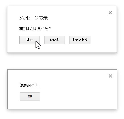 var re = ui.alert("メッセージ表示", "朝ごはんは食べた?", ui.ButtonSet.YES_NO_CANCEL);