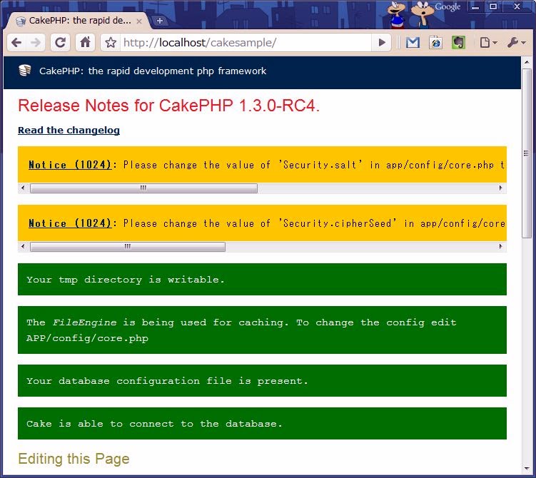 Your database configuration file is present.これが表示されたら、データベースが使える状態になっていることがわかります。もし表示されなかったら、設定ファイルの内容(特に、ファイルのパスや名前など)を再度確認してください。