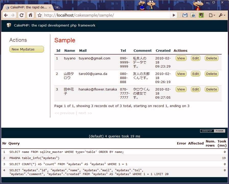 http://localhost/cakesample/sample/にアクセスしてみましょう。何が表示されたでしょうか。これは、かなり驚くはずですよ。データベースを利用する処理など全く何も書いてないのに、mydatasを利用するための機能がすべて用意された画面が現れるからです。