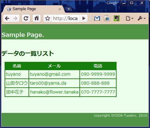 <tr><th>名前</th><th>メール</th><th>電話</th></tr>
