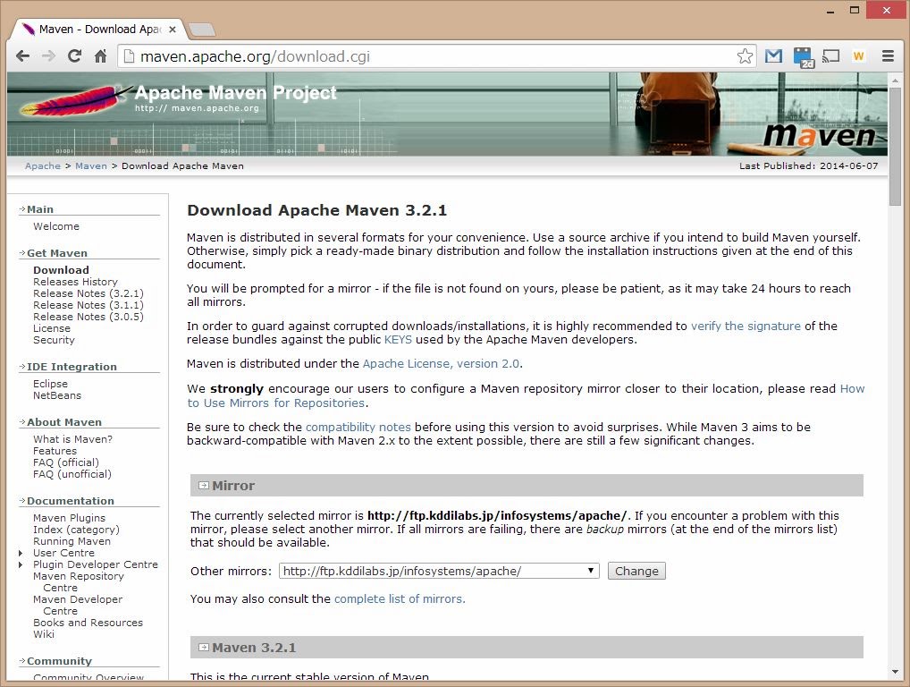 http://maven.apache.org/download.cgiここから、Mavenの最新版のバイナリファイルをダウンロードすることができます。ファイルはZip圧縮されており、展開して適当なところに配置します。そして