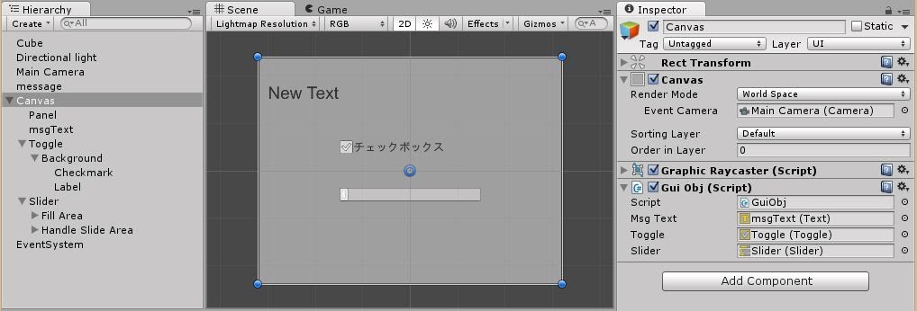 Slider」という項目が新たに追加されていますね。この2つに、それぞれシーンに配置した