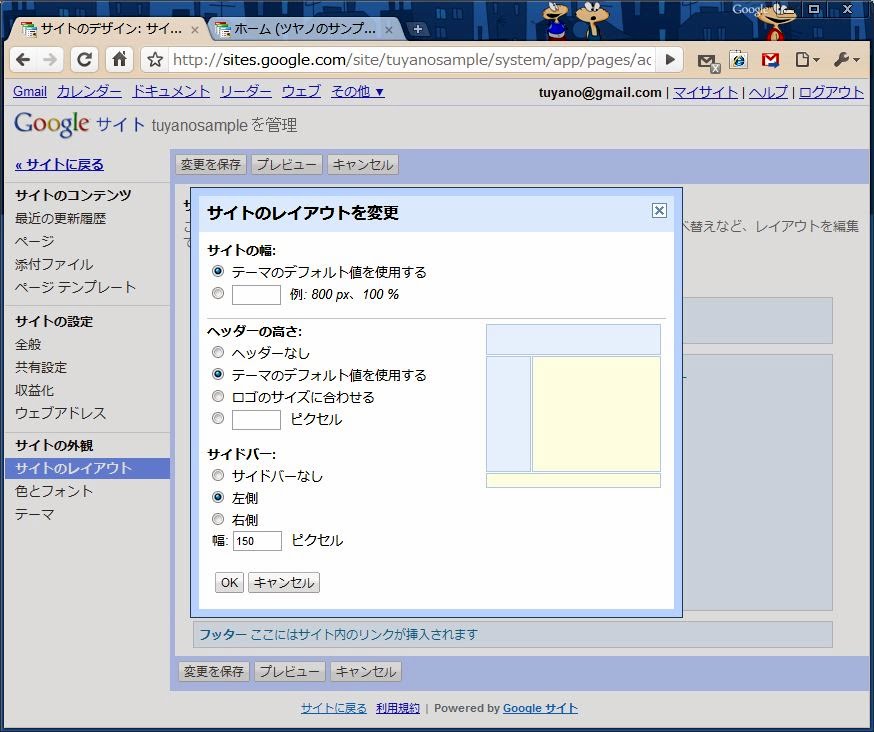 では、まずそれぞれのエリアの配置を考えます。「サイトのレイアウトを変更」ボタンを押すと、全体のレイアウトを調整するためのダイアログが現れます。ここでは以下のような項目が用意されています。