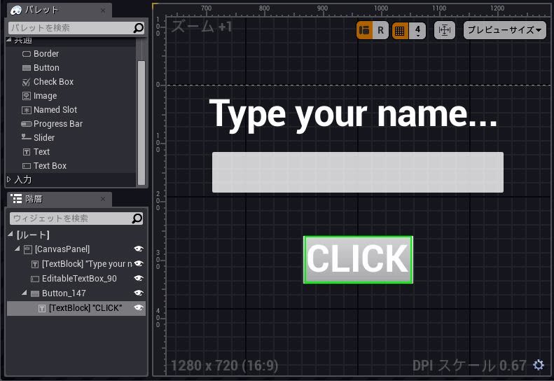 もう1つ、実は部品があります。それは、テキストを表示するTextです。これは、上の「Button」の中にドラッグ&ドロップして作ります。Textプロパティを「CLICK」と変更し、適当なフォントサイズに調整すれば、ボタンにテキストが表示されるようになります。