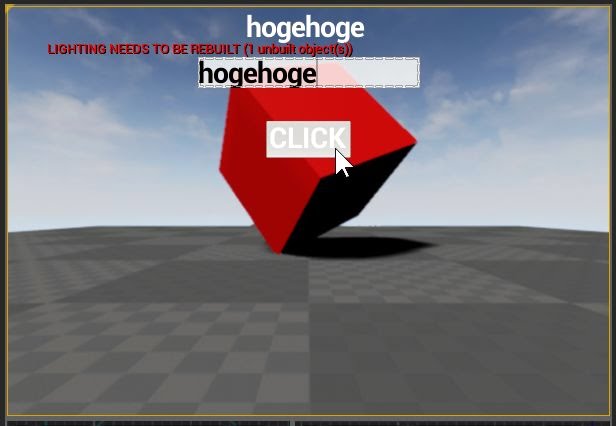 プレイ開始すると、画面にMyWidgetのGUIが重なって表示されるようになります。そのままTextBoxをクリックするとテキストが入力できるようになります。またButtonをクリックすれば、入力したテキストがそのまま画面に表示されます。