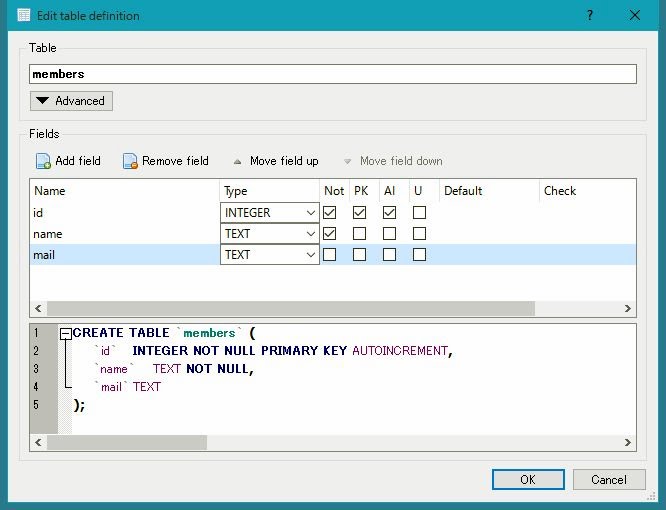 CREATE TABLE `members` ( `id` INTEGER NOT NULL PRIMARY KEY AUTOINCREMENT, `name` TEXT NOT NULL, `mail` TEXT ) CREATE TABLE `messages` ( `id` INTEGER NOT NULL PRIMARY KEY AUTOINCREMENT, `members_id` INTEGER NOT NULL, `title` TEXT NOT NULL, `comment` TEXT )