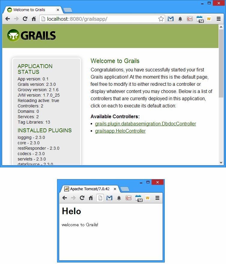 grailsapp.HeloController」というリンクが見えるはずです。これが、先ほど作ったコントローラーへのリンクです。これをクリックすると、コントローラーに用意しておいたHTMLが画面に表示されます。