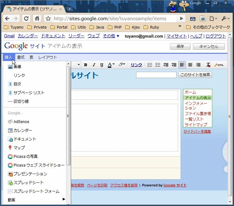 このメニュー類の中で、非常に重要な役割を果すのが「挿入」メニューです。これは、Googleサイトに用意されているさまざまな部品がまとめられたものです。ここからメニューを選ぶことで、Webページにさまざまなものを追加していくことができます。