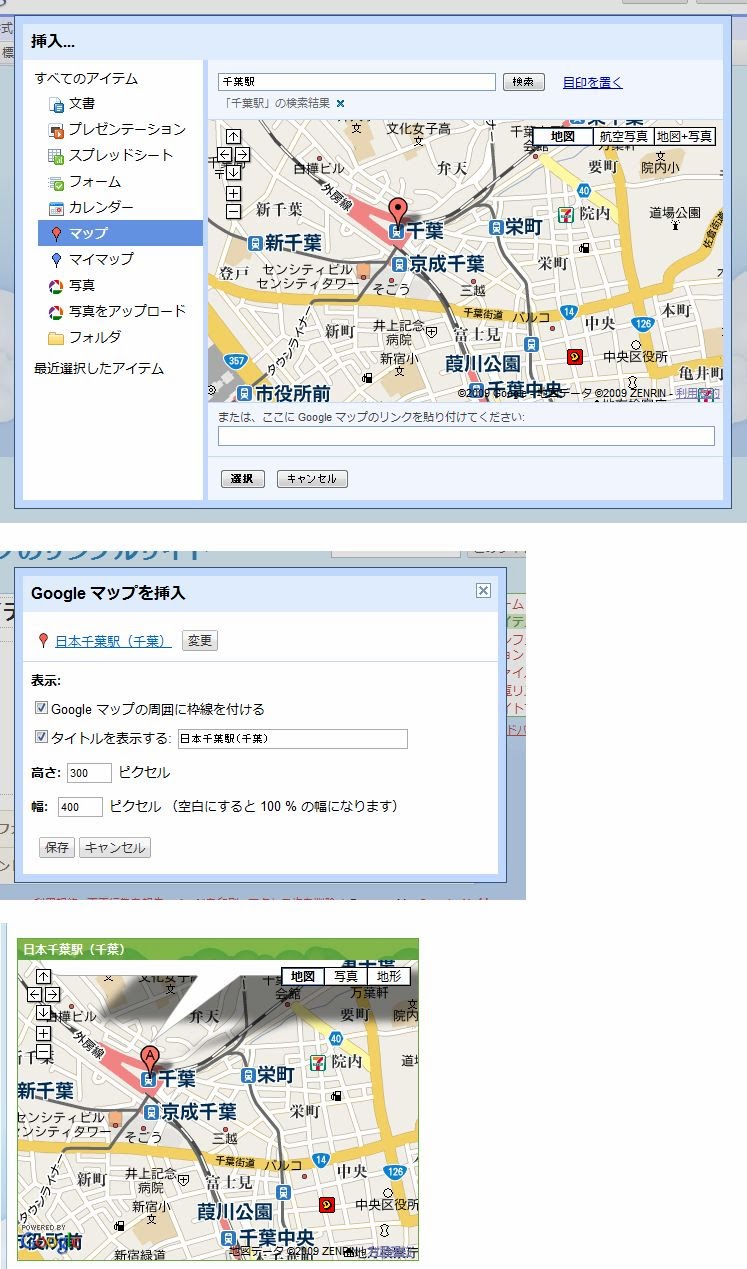 Googleマップは、地図を表示するのに今や不可欠なツールですが、これもごく簡単な操作でページに組み込むことができます。[マップ」メニューを選ぶと、画面にGoogleマップの表示がされたダイアログが現れます。これで、表示させた居場所に移動し、OKするだけです。