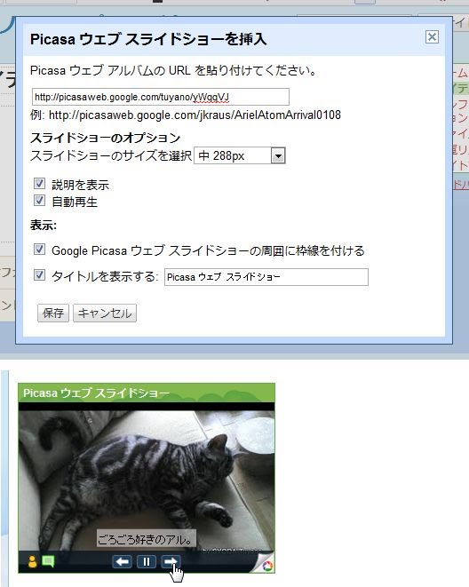 メニューから「Picassaウェブスライドショー」を選ぶと、設定のダイアログが現れます。ここでPicassaのアルバムのアドレスを入力し、スライドの大きさや説明の表示、ループなどの設定を行いOKすれば、スライドショーの部品が配置されます。