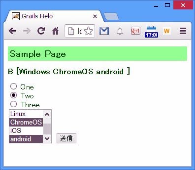 <g:radioGroup name="radio"サンプルでは、このようにタグが記述されています。valuesとlabelsには、それぞれMapリテラルが書かれています。そしてタグ内には、${it.radio} ${it.label}というように、itのradioとlabelを出力する式言語が書かれています。このタグ内の部分が、ラジオボタンの数だけ繰り返し出力されます。