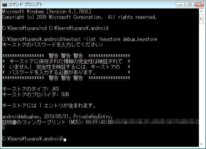 Microsoft Windows [Version 6.1.7600] Copyright (c) 2009 Microsoft Corporation. All rights reserved. C:\Users\利用者>cd C:\Users\利用者\.android C:\Users\利用者\.android>keytool -list -keystore debug.keystore キーストアのパスワードを入力してください: ***************** 警告 警告 警告 ***************** * キーストアに保存された情報の完全性は検証されて * * いません! 完全性を検証するには、キーストアの * * パスワードを入力する必要があります。 * ***************** 警告 警告 警告 ***************** キーストアのタイプ: JKS キーストアのプロバイダ: SUN キーストアには 1 エントリが含まれます。 androiddebugkey, 2010/05/31, PrivateKeyEntry, 証明書のフィンガープリント (MD5): 69:FF:A3:BB:80:……略…… C:\Users\利用者\.android>