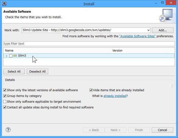 http://slim3.googlecode.com/svn/updates/3. 入力後、Engerキーを押すと、アクセスを行ない、インストール可能な項目がその下に一覧表示されます。ここでは「