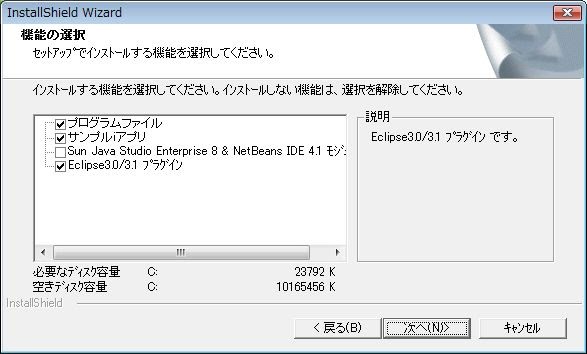 6.機能の選択画面になります。ここで、インストールする内容を選びます。「プログラムファイル」は必ずONにしてください。NetBeansやEclipseを持っている人は、そのモジュールやプラグインのチェックをONにしておきます。