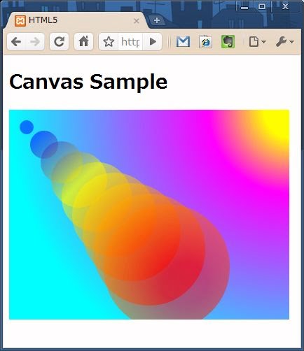 createRadialGradient( 横位置1, 縦位置1, 半径1, 横位置2, 縦位置2, 半径2 );このメソッドでは、2つの円の位置と大きさをそれぞれ指定します。これにより、1つ目の円の中心から2つ目の円の輪郭に向けてモーフィングするようにしてグラディエーションをするわけですね。