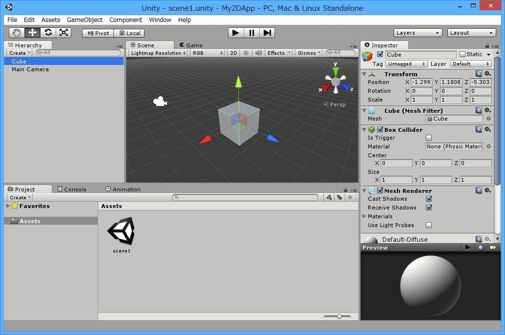 Hierarchy(構造)ビュー―左上にある「Main Camera」とか表示されているツールです。これは、現在のシーンに配置されているさまざまな部品の組み込み具合を階層的に表示します。ここで部品を選択すれば、その部品を編集できるようになります。