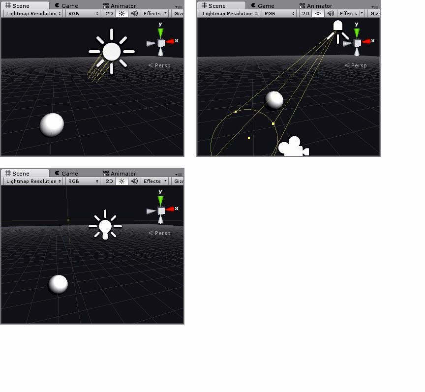ゲームオブジェクトは、図形のモデルだけではありません。ライトもゲームオブジェクトとして用意されます。このライトもいくつかの種類が用意されています。これも簡単に整理しておきましょう。