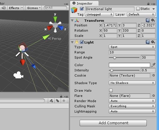 ――たくさんありますが、とりあえずRange/Spot Angle、Color、Intensityといった基本的な設定だけ覚えておけば十分でしょう。それ以外のものは、「ある程度Unityを使いこなせるようになってから利用するもの」と割りきって、当分、忘れてしまいましょう!