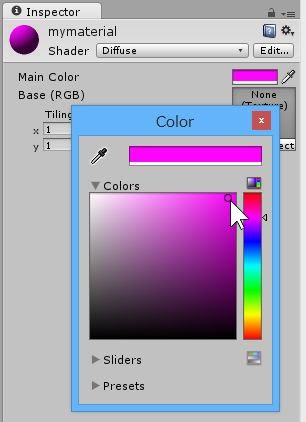 Main Colorの右側にある、白い四角い領域をクリックすると、画面に色を選択するためのウインドウが現れます。ここで使いたい色を選べば、それがMain Colorに設定されます。