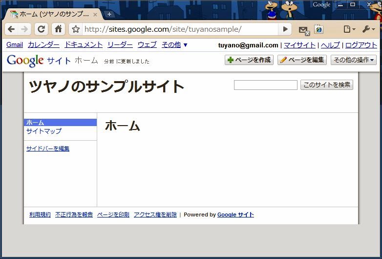 ページの左側には、「ホーム」「サイトマップ」といった項目が並んだエリアが用意されます。これは「サイドバー」といって、よく使われる機能やページをまとめて置くところです。これは、あらかじめ表示される内容がいくつか用意されていて、それらを選んで作成します。