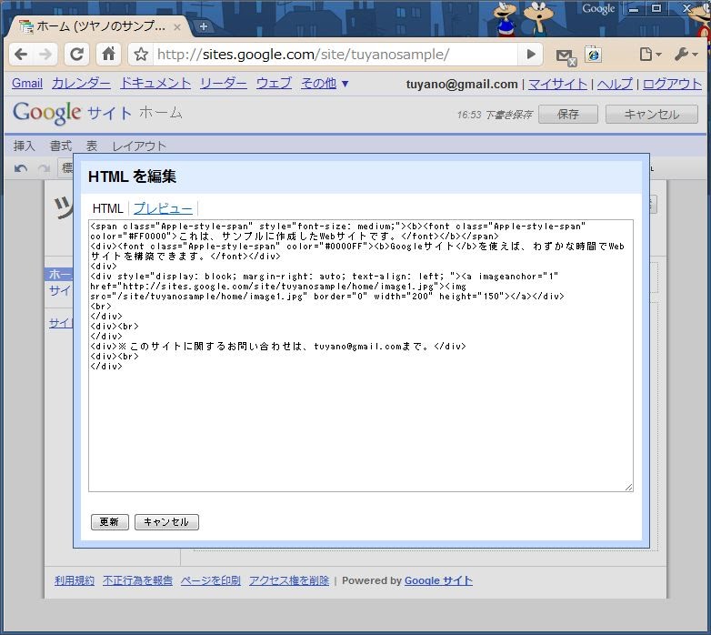<span class="Apple-style-span" style="font-size: medium;"><b><font class="Apple-style-span" color="#FF0000">これは、サンプルに作成したWebサイトです。</font></b></span> <div><font class="Apple-style-span" color="#0000FF"><b>Googleサイト</b>を使えば、わずかな時間でWebサイトを構築できます。</font></div> <div> <div style="display: block; margin-right: auto; text-align: left; "><a imageanchor="1" href="http://sites.google.com/site/tuyanosample/home/image1.jpg"><img src="/site/tuyanosample/home/image1.jpg" border="0" width="200" height="150"></a></div> <br> </div> <div><br> </div> <div>※このサイトに関するお問い合わせは、tuyano@gmail.comまで。</div> <div><br> </div>