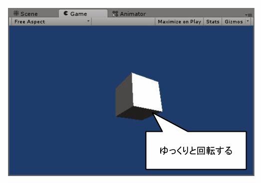 Updateで行っているのは、CubeをX, Y, Zのそれぞれの向きに1度だけ回転する、というものです。それがシーンを実行するとゆっくりと回り続けます。
