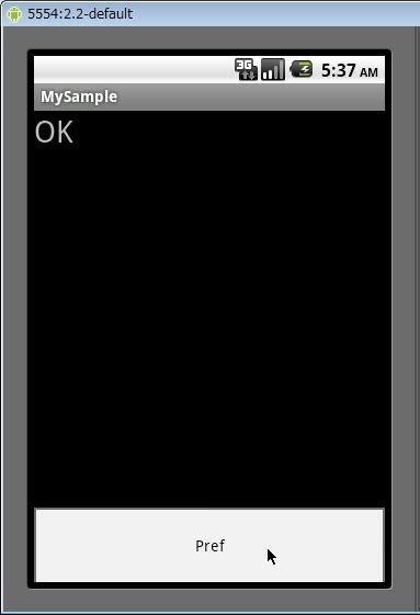 Intent intent = new Intent(this, (Class<?>)MySamplePrefActivity.class);ここでは、new Intentでインテントをまず用意します。引数には、Context(ここではthis)と、起動するアクティビティのclassを渡します。これで、MySamplePrefActivityを起動するためのインテントが用意できます。
