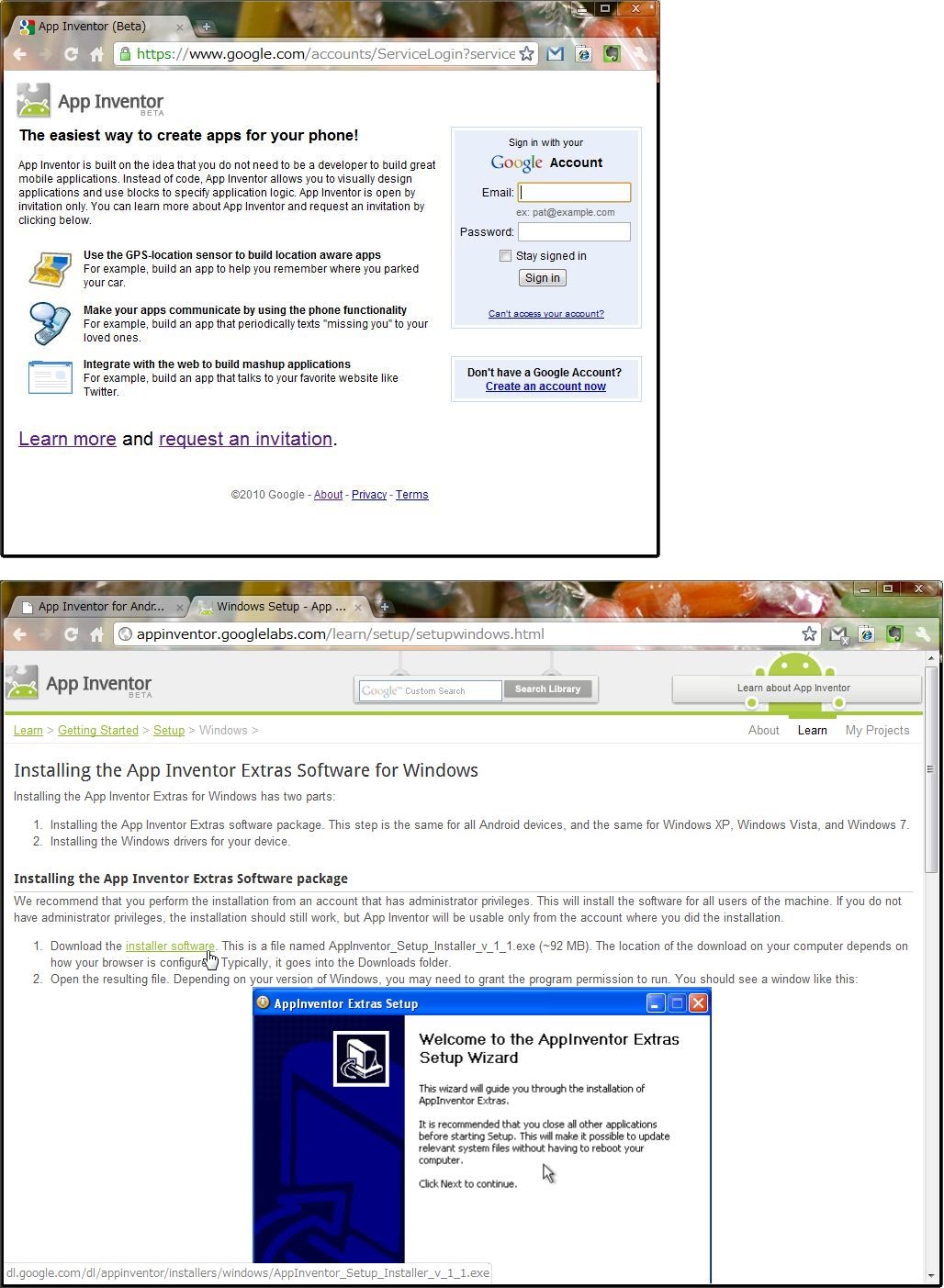 ・Google運営サイトのセットアップページ http://beta.appinventor.mit.edu/learn/setup/setupwindows.html これらのページの「1. Download the installer software.」というところのリンクをクリックすると、AppInventorExtrasのインストーラがダウンロード出来ます。ページに書かれている内容を読みながらインストールを行ってください。