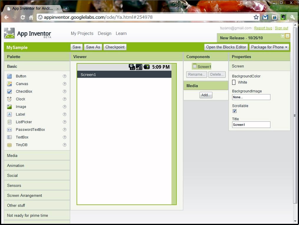 デフォルトでは、Screen1のプロパティが表示されています。BackgroundColor、BackgroundImage、Scrollable、Titleといったものですね。これで、背景色、背景のイメージ、スクロール可能かどうか、タイトル名――といったことが設定されます。