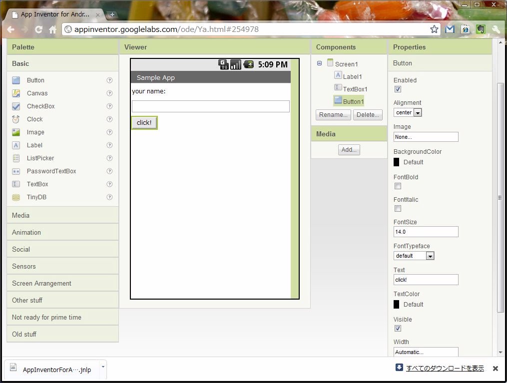 初期状態では、コンポーネント・エリアに「Screen1」という項目が表示されています。これは、画面に関する部品です。これを選択し、右側にあるプロパティの欄から「Title」を「Sample App」と書き換えてみましょう。画面のタイトル表示が変更されます。