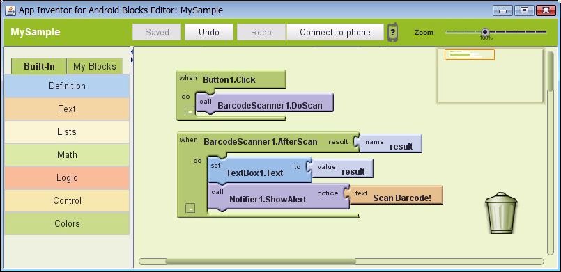 Button1.Click」の凹み部分にはめ込みます。これが、バーコードをスキャンする処理の部品です。たったこれだけで、「ボタンをクリックするとバーコードをスキャンする」ということができてしまいます!