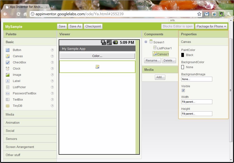これもパレットの「Basic」に入っています。「Canvas1」という名前で配置されます。配置したら、プロパティの「Width」「Height」をそれぞれ「Fill Parent」にしておいてください。ただし、設定しても調整されるのは横幅だけで、高さは調整されません。これは、あとでブロック・エディタで修正をするので、ここではそのままにしておきます。