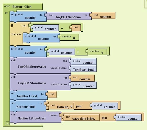 ※[Button1.Click]の内容 [setglobal counter to][TinyDB1.GetValue][text counter] [if] [=][global counter][text] [setglobal counter to][number 0] [setglobal counter to][+][global counter][number 1] [TinyDB1.StoreValue] [global counter] [TextBox1.Text] [TinyDB1.StoreValue] [text counter] [global counter] [set TextBox1.Text to][text] [set Screen1.Title][join][text Data No,][global counter] [Notifier1.ShowAlert][join][text save data in No,][global counter]