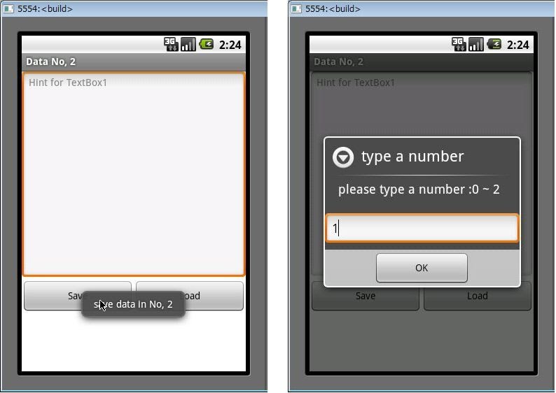 さて、アプリを起動したら、メモ欄に適当にテキストを書いてButton1を押しましょう。その内容が番号を割り振られて保存されます。いくつかメモを書いたところで、Button2をクリックし、取り出したいメモの番号を入力してみてください。その番号のメモが表示されます。なかなか便利でしょう?