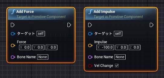 2つのノードの違いは、「押す」と「ぶつける」でしょう。「Add Force」は、持続して力を加え続けるようなときに使います。例えば、Tickイベントを使って連続して一定時間、力を加えていくような場合にはAdd Forceがいいでしょう。