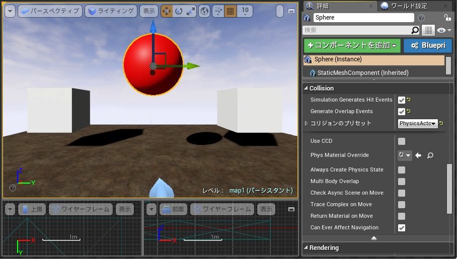 Simulation Generates Hit Events――これは「ヒットイベント」に関するものです。ヒットイベントは、何かと衝突した瞬間に発生するイベントです。このチェックをONにすると、他のアクタと衝突した瞬間にヒットイベントが発生するようになります。