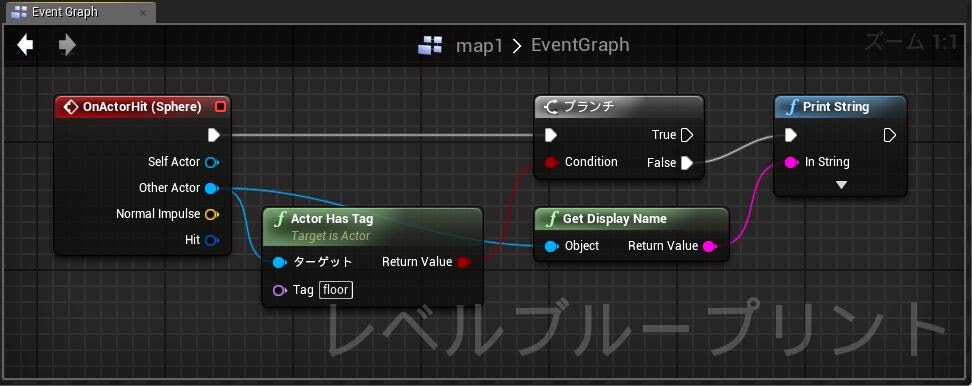 ここでは、ヒットイベントの際に衝突した相手のアクタに「floor」タグが設定されているか調べ、「False」なら(つまり設定されていないなら)Print Stringしています。