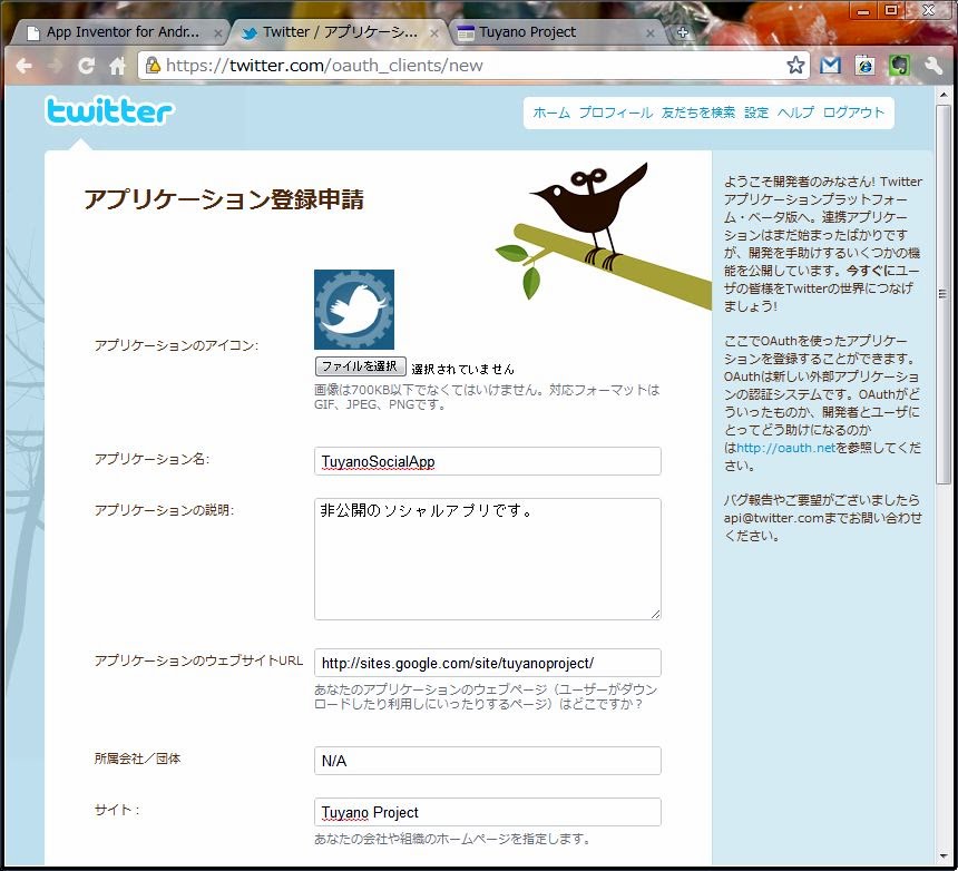 コンシューマ・シークレットがその場で発行されます。登録内容は、ざっと以下のようになります。