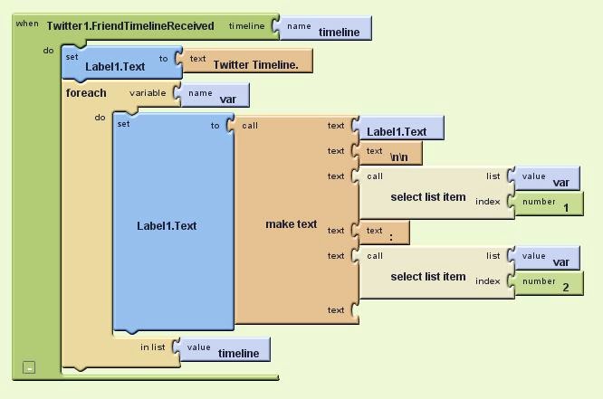 ※[Twitter1.FriendTimelineReceived]の処理 [set Label1.Text to][text Twitter Timeline.] [Label1.Text][Twitter1.Timeline] [foreach]to[var] do[text Label text...] [text \n\n] [select list item][value var][number 1] [text :] [select list item][value var][number 2] in list[value timeline]