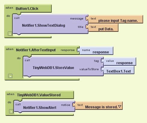 で、Notifier1.AfterTextInputの処理です。これは、入力された値をタグにして、TextBox1の値を送信する処理を用意します。これは、TiInyWebDB1の「StoreValue」というものを利用します。右側には、保管するタグ名と値をそれぞれ指定します。タグ名は、AfterTextInputで渡されるresponseを指定し、値にはTextBox1のTextを指定します。