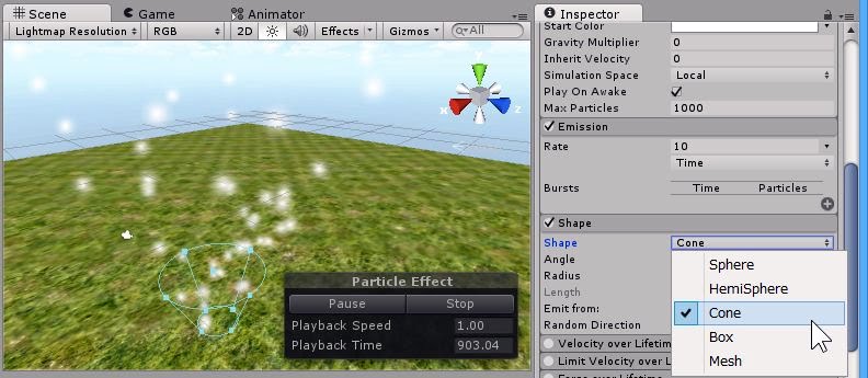 ※Shapeの設定で、放出する空間の形状をいろいろと変えられる。