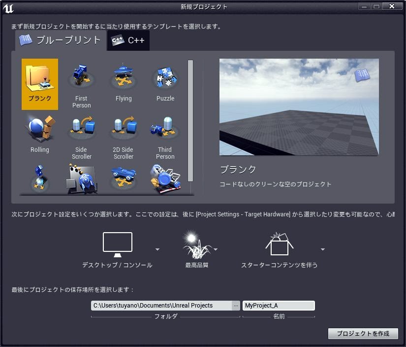 Unreal Engine 4以降、プロジェクトを新たに作成する際には、「C++」と「ブループリント」を選択するようになりました。